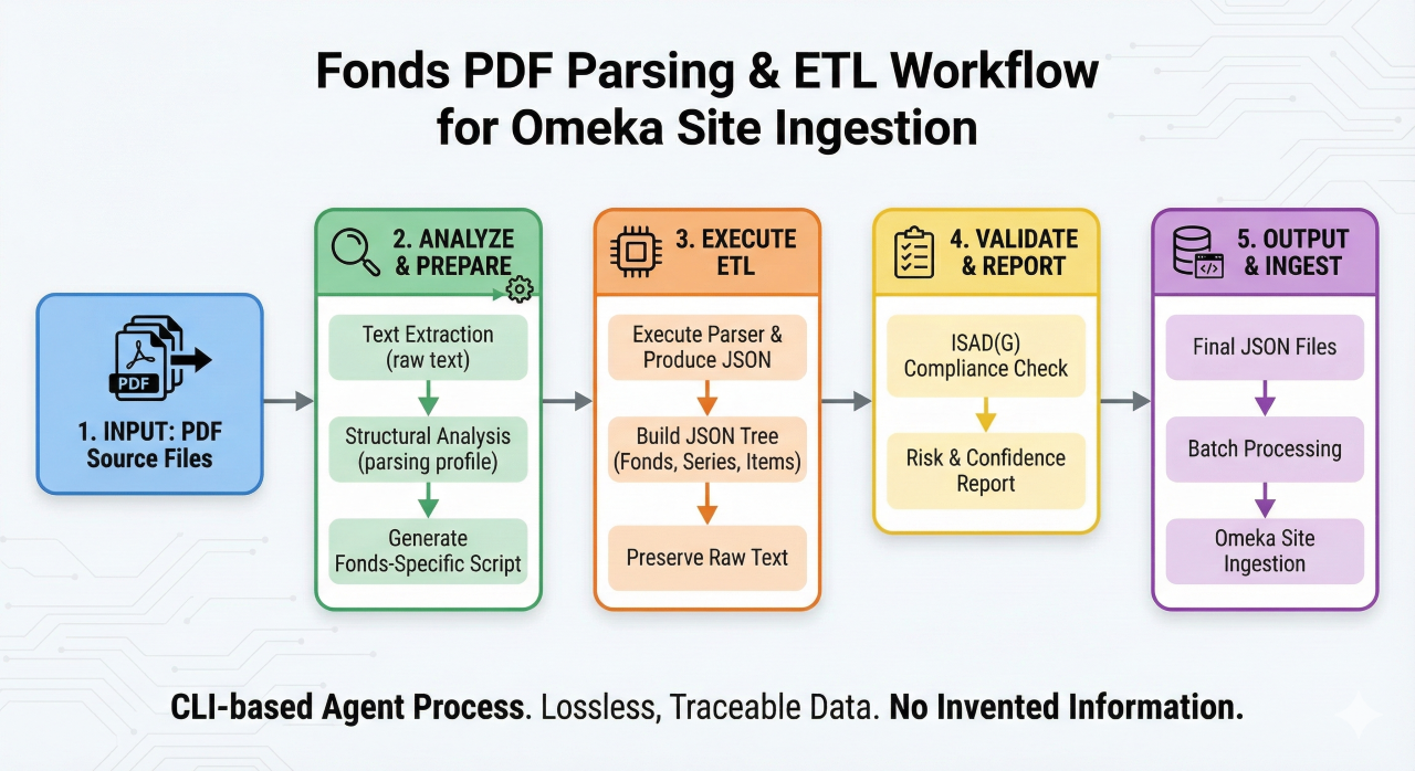 This site grants digital access to archival descriptions that previously existed solely as static PDF inventories. To migrate these complex historical "fonds" into a searchable Omeka S environment, we executed a rigorous extraction, transformation, and loading (ETL) pipeline driven by a specialized CLI-based coding agent.